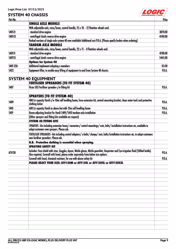The Logic System 40 sprayer is based on a “Hardi” unit and is simply bolted on the unique cross-member of the System 40 chassis.